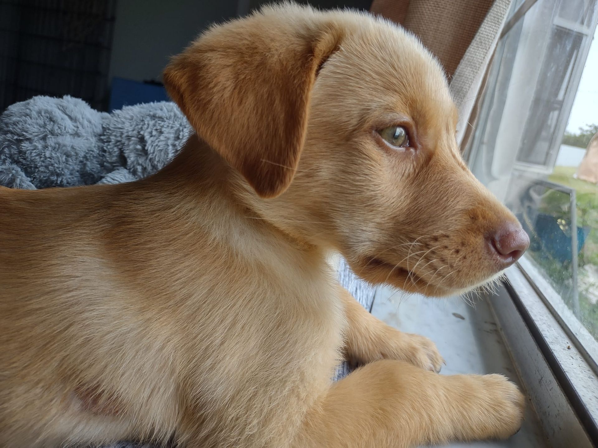 Yellow Labrador Retriever. AKC registered. He has green eyes and a liver nose. Charting out to be 75 pounds. Father has champion hunting awards. Mother is from a long line of service animals. Tucker is a playful sweetheart. He is obsessed with being outside, probably the hunter in him but loves climbing into your lap to cuddle when he comes back in. A people person, he adores everyone. With his lineage including ESA and service animals, this explains why he is so intuitive and loving.