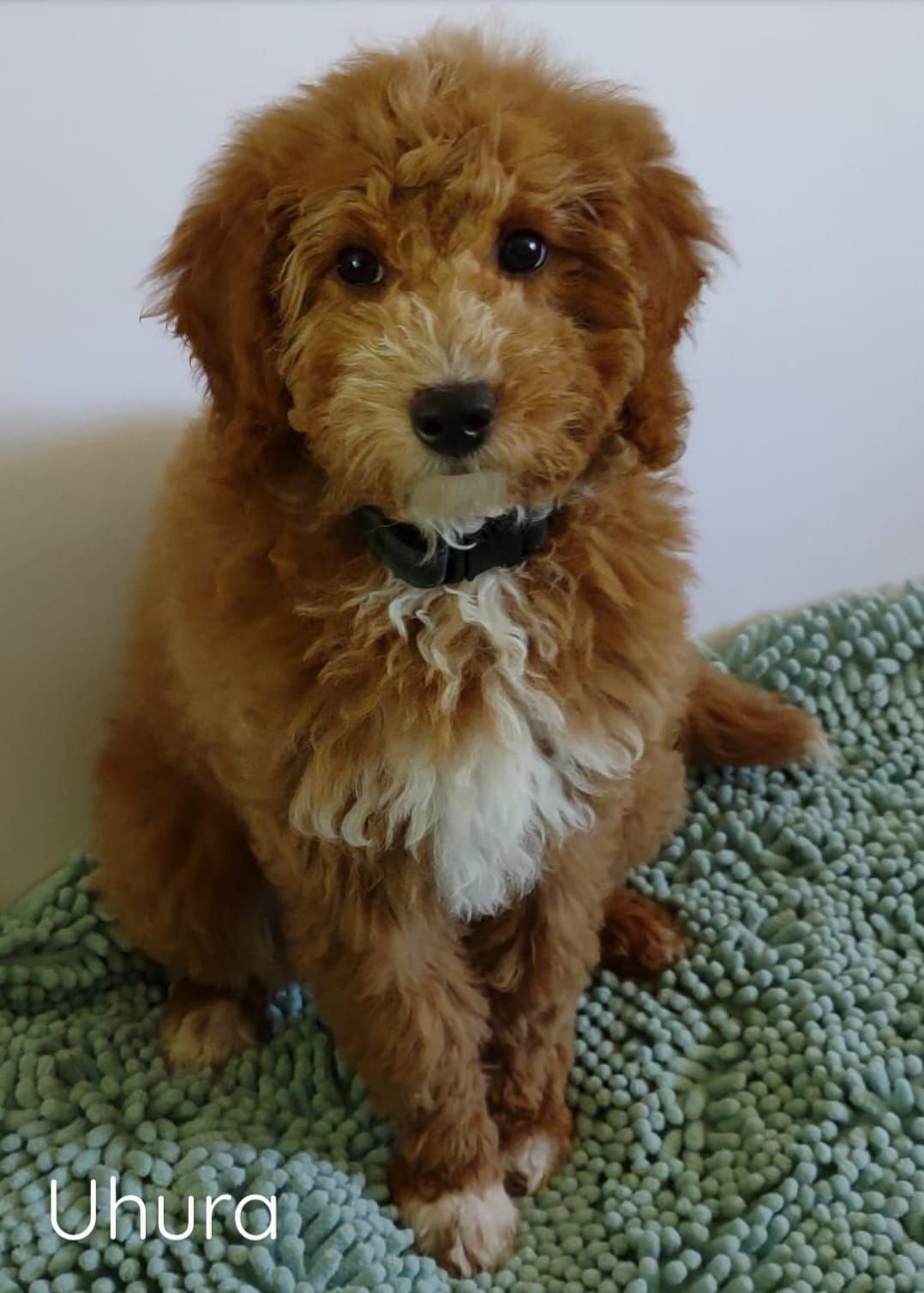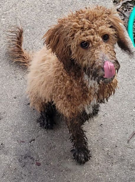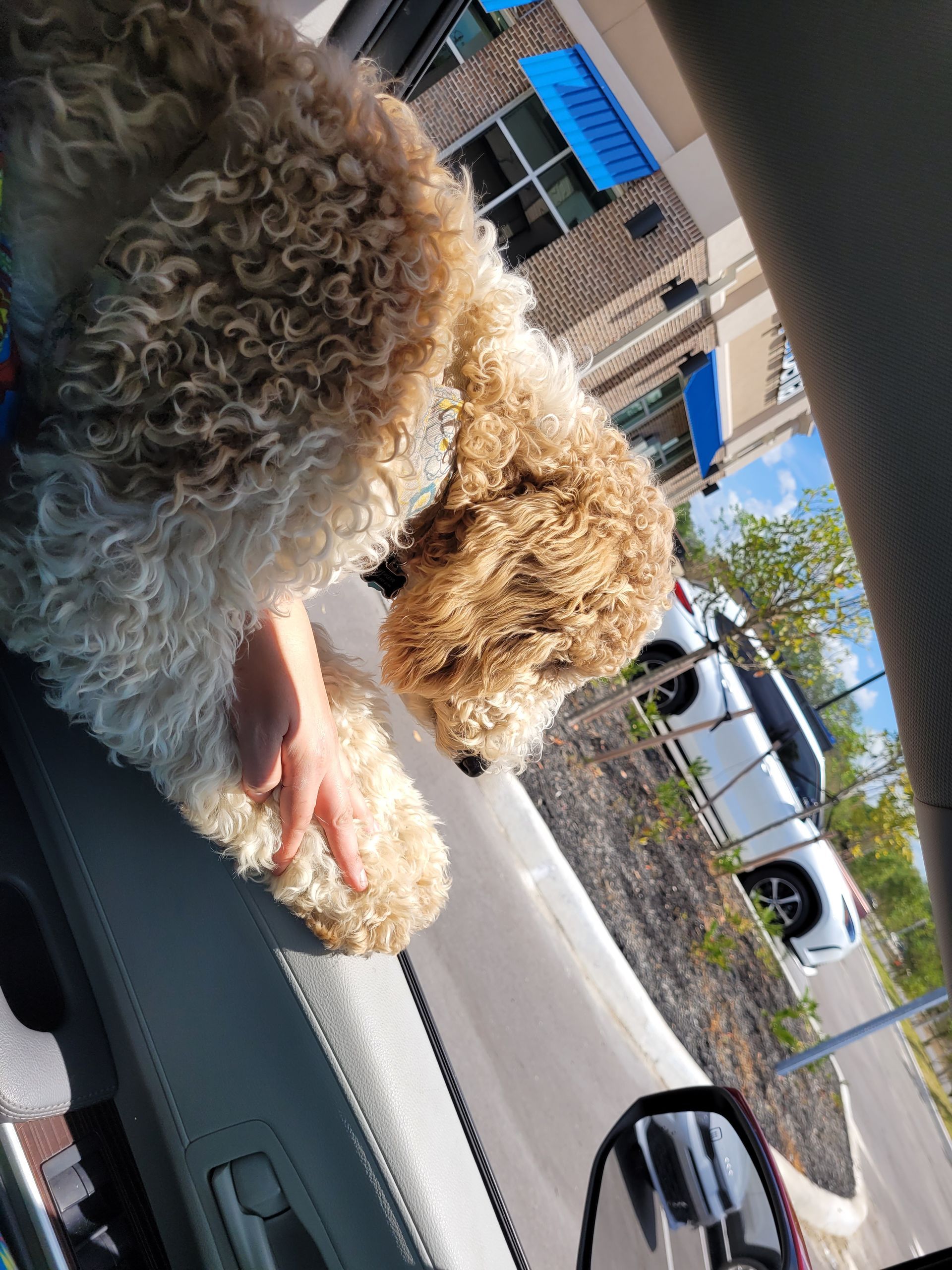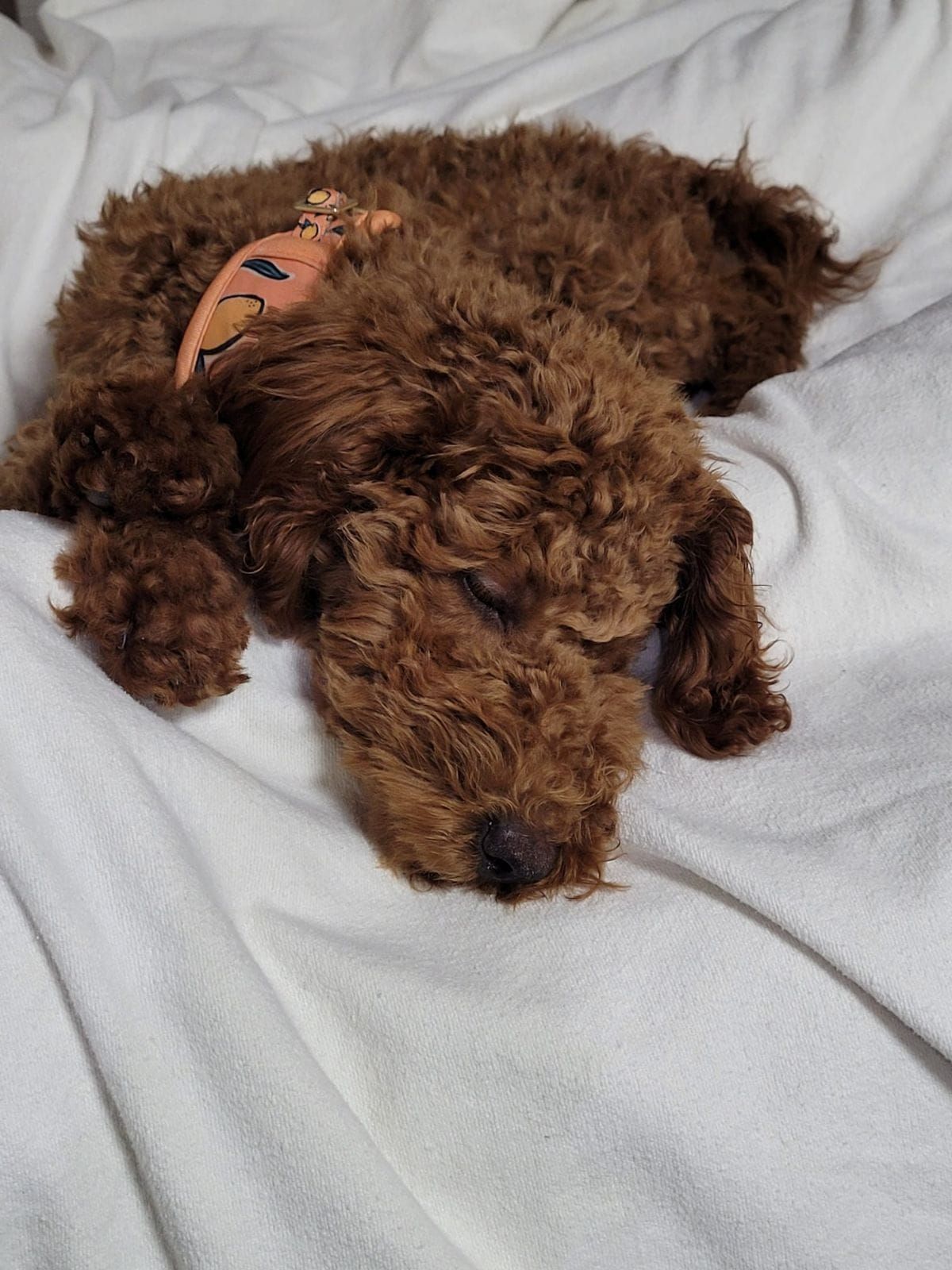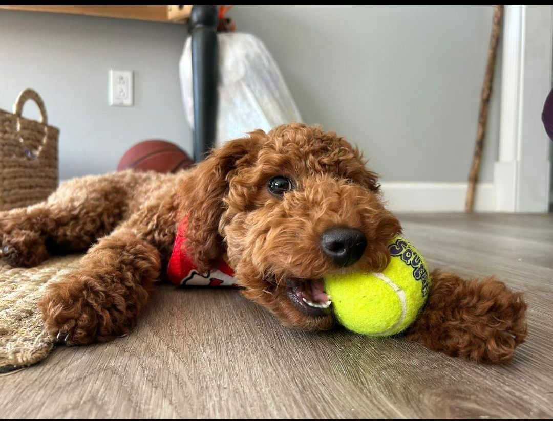 AKC registered Red Mini Poodle. Charting out to be 15 lbs. Our newest addition, she is truly something special. Her favorite thing to do is cuddle with her family. Toys are fun for a while, but she would rather be snuggled up next to you, or even better, on you. She's a little shy to meet regular people at first, but if there's a sad, ill, or stressed out human being anywhere around her, she's going to walk right up and climb into their lap to instantly make their lives better. A true ESA and Therapy worthy dog. She charms everyone she meets. Running around with her older siblings and meeting new dogs is fun too!