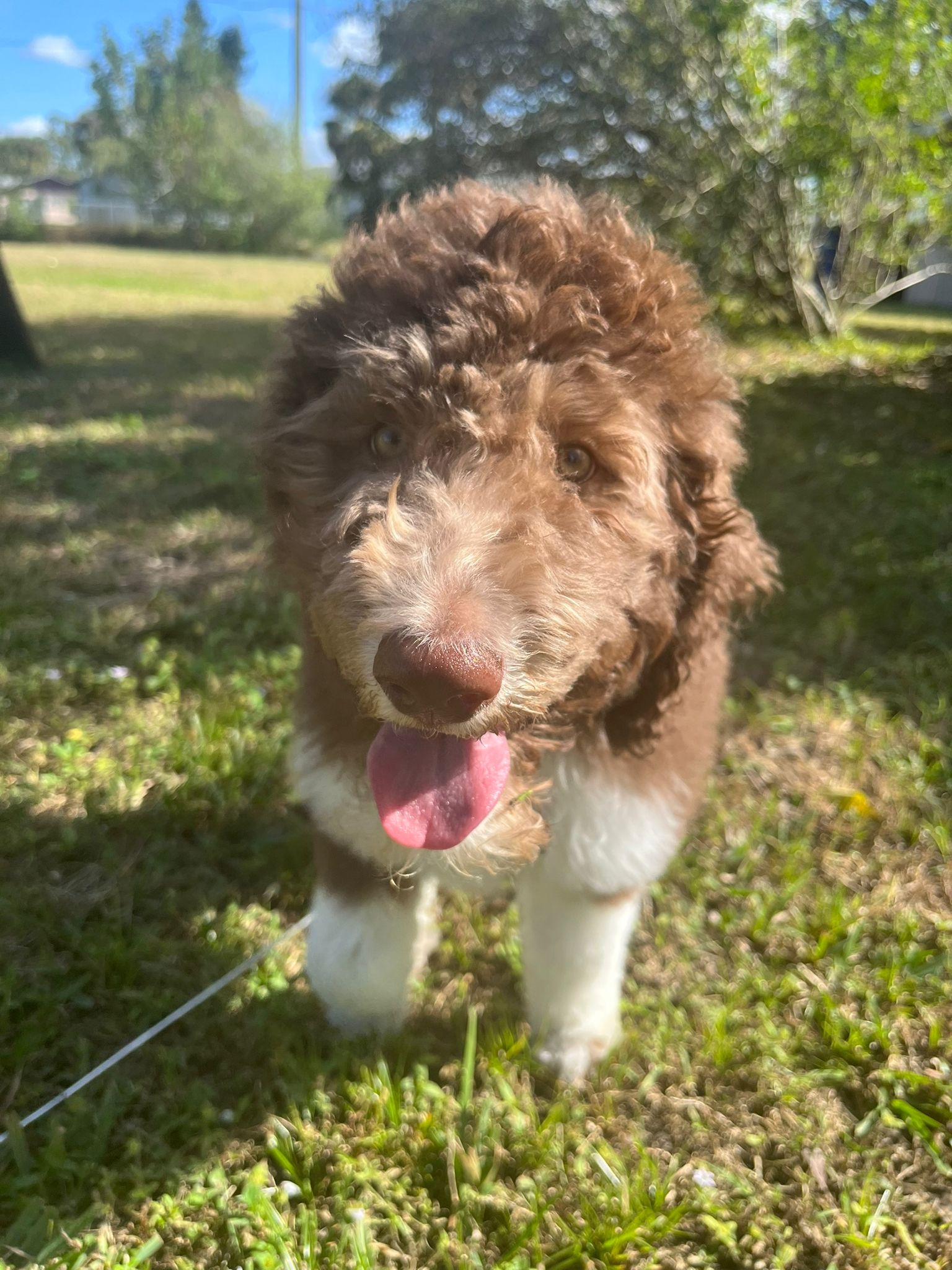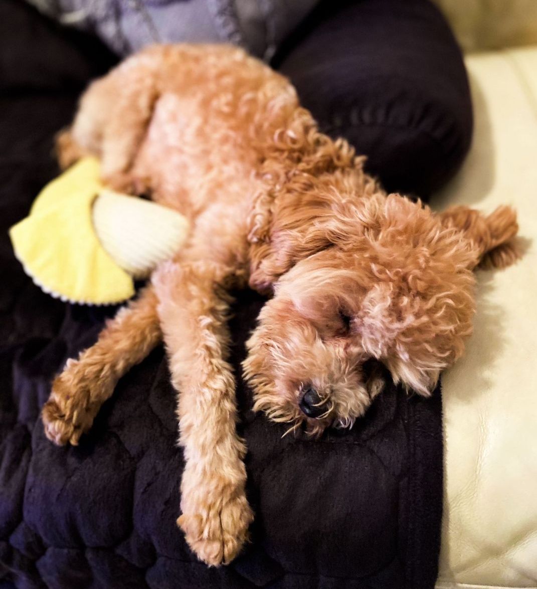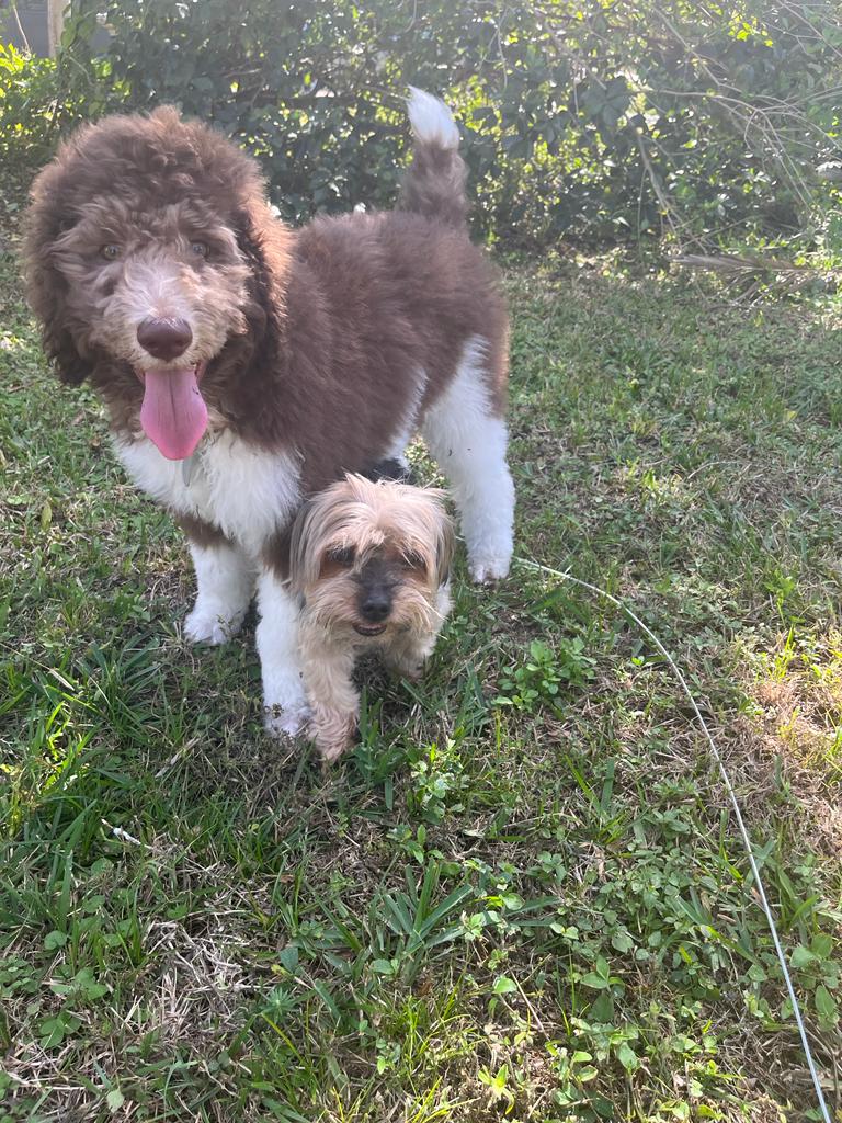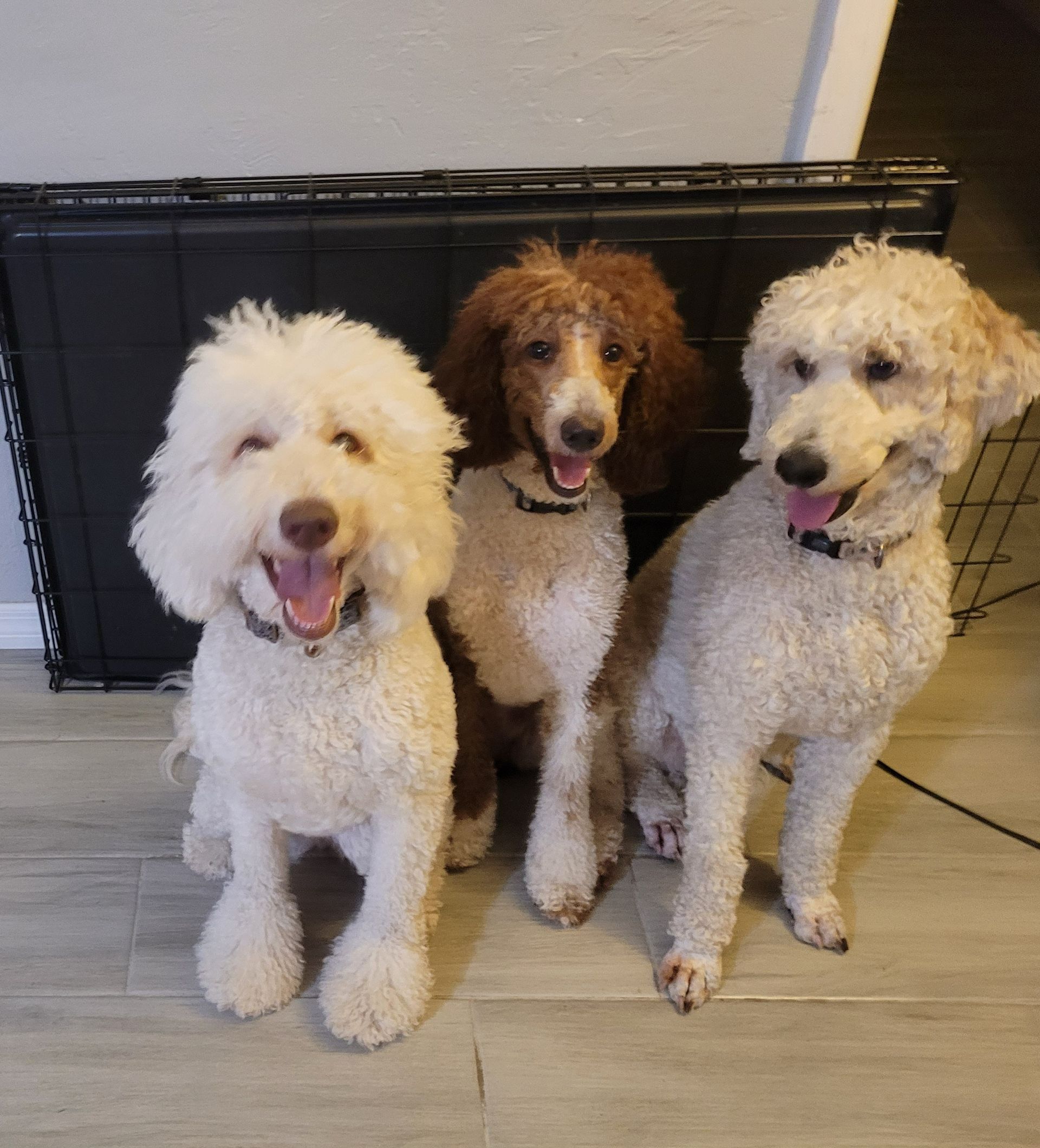 AKC registered Red Mini Poodle. Charting out to be 15 lbs. Our newest addition, she is truly something special. Her favorite thing to do is cuddle with her family. Toys are fun for a while, but she would rather be snuggled up next to you, or even better, on you. She's a little shy to meet regular people at first, but if there's a sad, ill, or stressed out human being anywhere around her, she's going to walk right up and climb into their lap to instantly make their lives better. A true ESA and Therapy worthy dog. She charms everyone she meets. Running around with her older siblings and meeting new dogs is fun too!