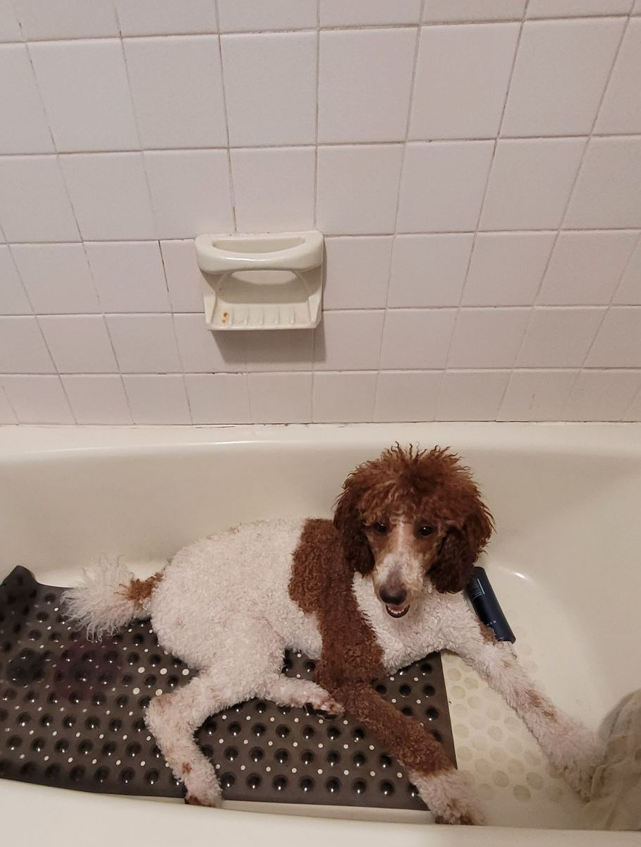 This handsome teddy bear just loves people and dogs he can't get enough. He is a chocolate and white parti, with a wavy soft coat and he is such a good boy during grooming.